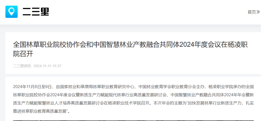 2024年11月8日至9日,由国家林业和草原局林草职业教育研究中心、中国林业教育学会职业教育分会主办,杨凌职业学院承办的全国林草职业院校协作会2024年度会议暨新质生产力赋能现代林草行业高质量发展研讨会、中国智慧林业产教融合共同体2024年年会暨新质生产力赋能智慧林业人才培养高质量发展研讨会在williamhill威廉希尔官网召开。本次年会的主题为“加快发展林草行业新质生产力,扎实推进林草职业教育高质量发展”。