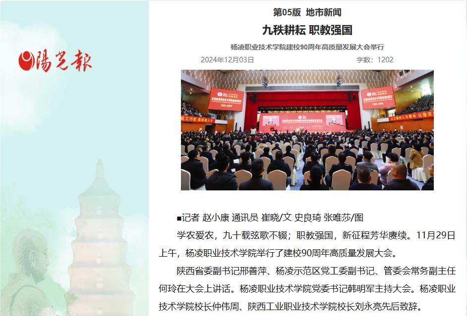 仲伟周代表学校作了题为《秉承九秩荣光奋进百年梦想》的致辞,深情回顾了学校90年来波澜壮阔的办学历程。他说,90年来,学校在坚守初心中服务祖国人民,在砥砺深耕中践行育人使命,在求实创新中打造职教标杆,在融合发展中推进开放办学,在三秦大地上绘就了一幅恢宏壮阔的历史画卷。迈向新征程,学校将义无反顾、责无旁贷地接过先辈们的接力棒,加强党的全面领导,坚定服务“国之大者”,高举农业职业教育旗帜,坚持融合发展理念,锚定高质量发展目标,以更加昂扬的斗志、更加奋进的姿态,为加快建设中国特色、世界一流职业大学而不懈奋斗,在服务陕西和国家建设、推动农业农村现代化、圆梦中华民族的伟大复兴新征程上,再立新功、再创辉煌!