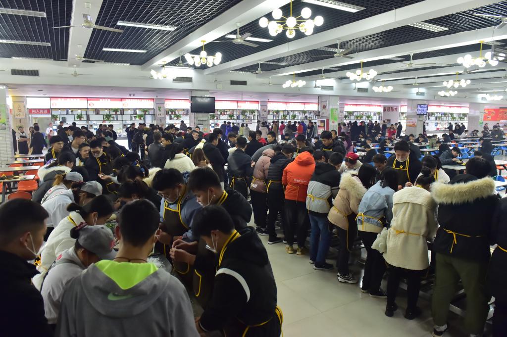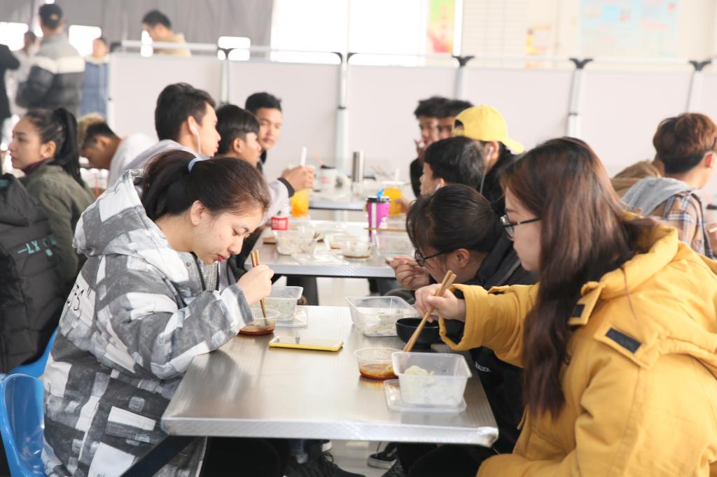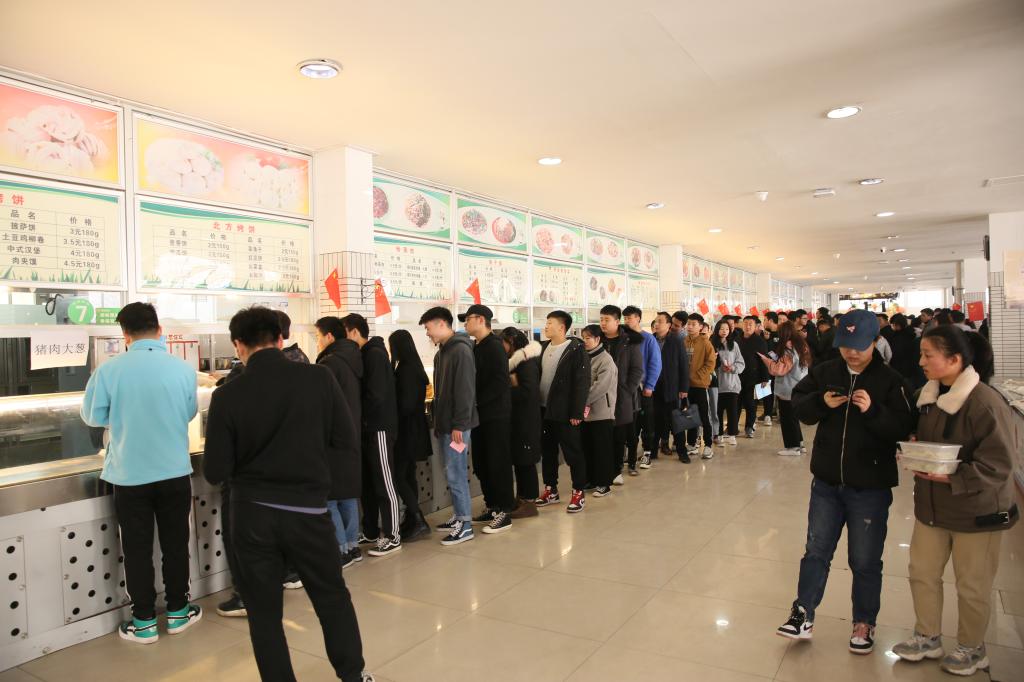 上午10点半,学院南、西、北三个校区的餐厅里,已有不少师生陆续拿着餐券在各个橱窗前排队等候,不一会儿,一盘盘热气腾腾、美味可口的饺子就已上桌。虽然室外寒气袭人,但每个餐厅里却是热闹非凡、温暖四溢。吃着自己亲手包的饺子,大家有说有笑,心里乐滋滋的。