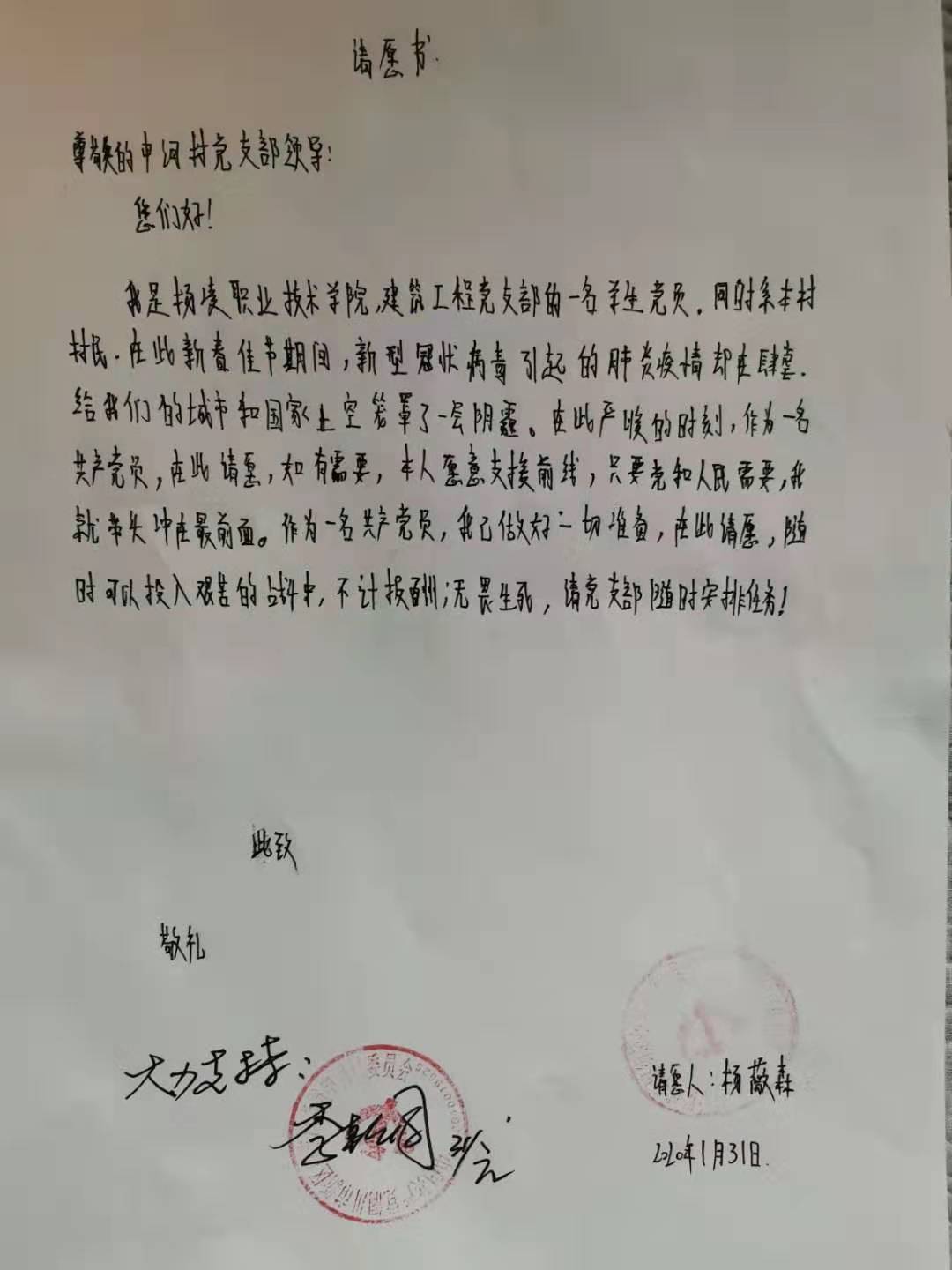 “尊敬的申河村党支部领导:您们好!我是williamhill威廉希尔官网建筑工程党支部的一名学生党员,同时系本村村民。在此新春佳节期间,新型冠状病毒引起的肺炎疫情却在肆虐,给我们的城市和国家上空笼罩了一层阴霾。在此严峻的时刻,作为一名共产党员,在此请愿,如有需要,本人愿意支援前线,只要党和人民需要,我就带头冲在最前面。作为一名共产党员,我已做好一切准备,在此请愿,随时可以投入艰苦的战斗中,不计报酬,无畏生死,请党支部随时安排任务!”