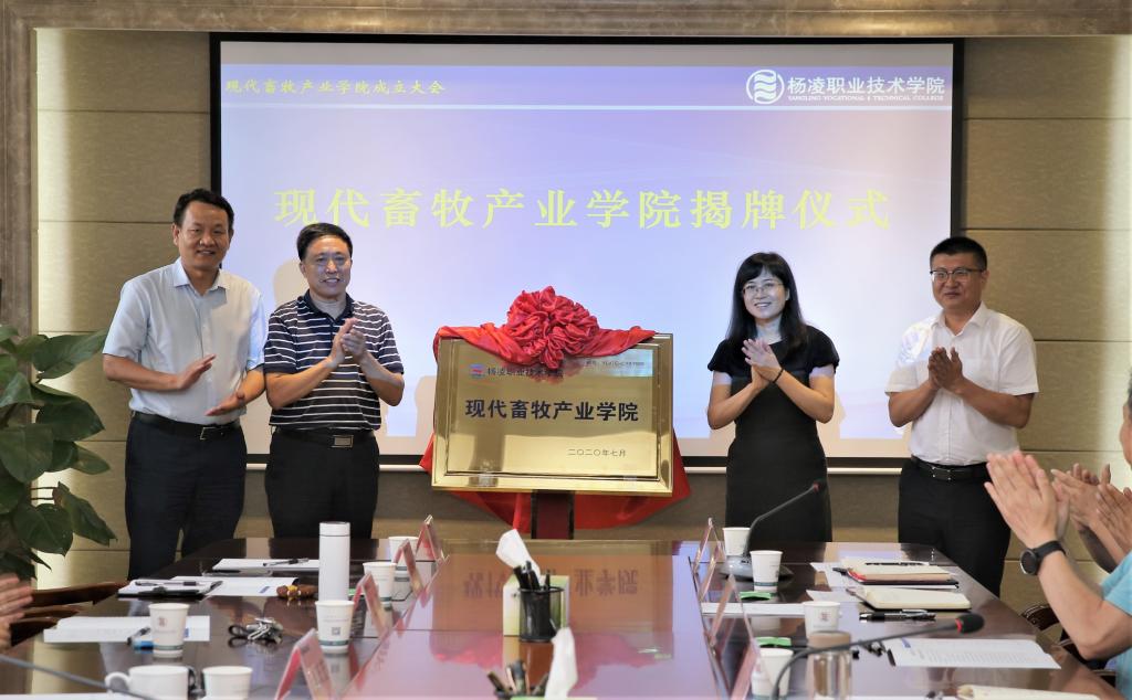 陈宁、郭庆宏、乔冰涛、黎骏驹共同为现代畜牧产业学院揭牌