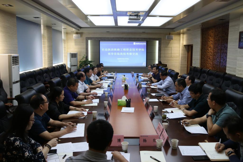 9月17日,陕西铁路工程职业技术学院党委书记王津,校长焦胜军,党委副书记郑毅刚,副校长蒋平江、张学钢、贺建锋、任娟娟,党委(校长)办公室主任、党委宣传部部长、就业中心主任、校企合作处处长、校友工作处处长、人事处处长等一行12人来我院参观交流。我院院长王周锁、党委副书记任得元、副院长张迪,党政办公室、党委组织部、党委宣传部、发展规划处、产教融合处、招生就业处、人事教师处相关人员进行座谈交流。