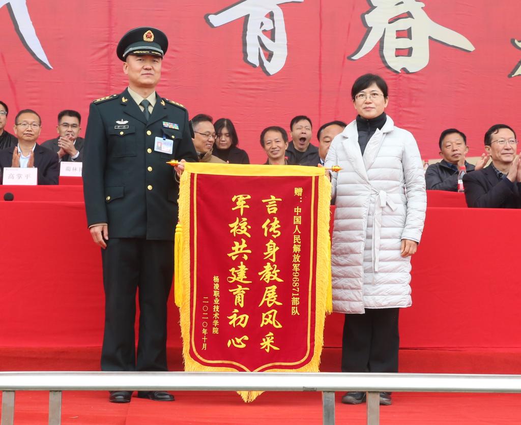 党委书记陈宁代表学校向军训部队赠送锦旗
