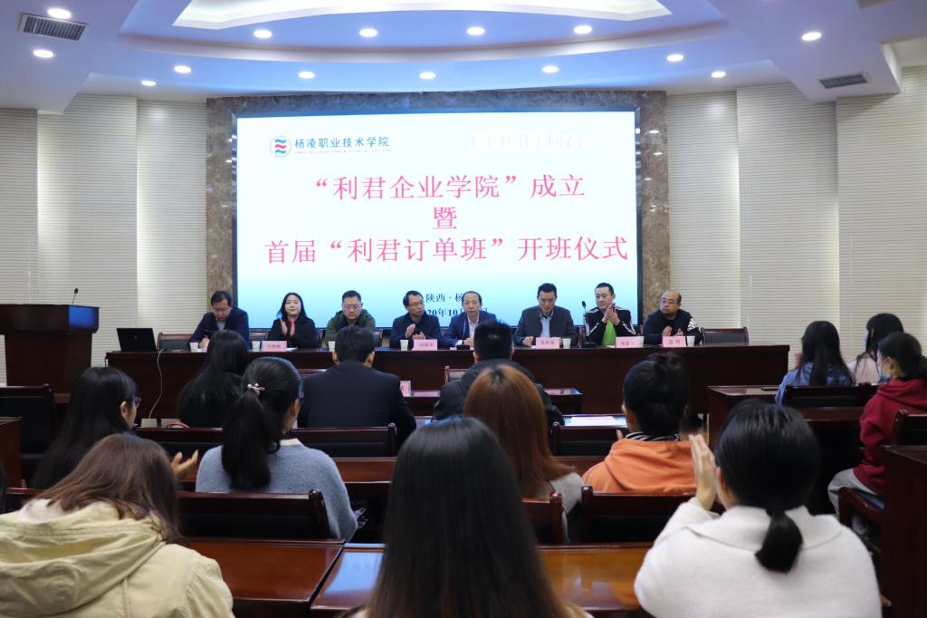 10月30号下午,威廉希尔官网“利君企业学院”成立暨首届“利君订单班”开班仪式在南校区水韵楼报告厅举行。药物与化工分院党总支书记刘根牢、院长周博、副院长龙凤来,西安利君制药有限责任公司人事处处长李俊锋、固体制剂车间技术主任李富平、合成车间技术主任延河、人事处主管司林婧,药学和药品生产技术教研室专业教师以及首届35名订单班学员参加大会。大会由产教融合处副处长郑爱泉主持。