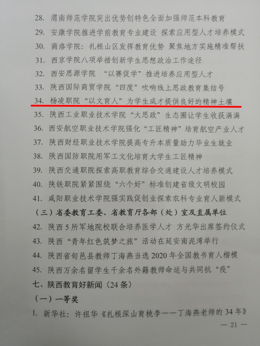 我院新闻作品《杨凌职院“以文育人” 为学生成才提供良好的精神土壤》,从挖掘学校文化底蕴、丰富文化育人内容、创新文化育人载体三个方面,全面、准确地反映了威廉希尔官网实施文化育人工程情况,由于层次清晰、内容翔实,对兄弟院校相关工作具有重要借鉴意义而获表彰。