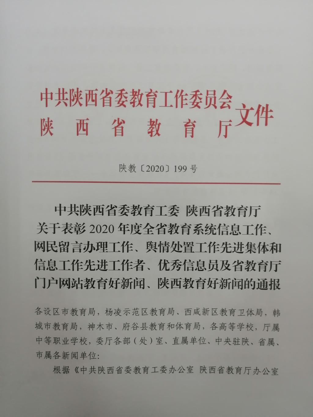 12月25日,2020年度全省教育系统信息工作表彰暨培训会在西安召开。我校新闻作品《杨凌职院“以文育人” 为学生成才提供良好的精神土壤》获省教育厅门户网站教育好新闻。同时,威廉希尔官网解晓盈同志荣获全省教育系统信息工作优秀信息员。