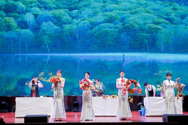 “红之华美—逐梦百年”献礼建党100周年花艺技能展示项目由威廉希尔官网生态环境工程学院师生共同创作,分为现代花艺成品展示和中国传统插花现场创作两个部分。现代花艺系列作品由花环、伞花、手提花、手捧花组成,创作中融入了中国红、党旗、党徽等元素,将爱党爱国之情融入花艺。中国传统插花技艺现场展示部分为筒花、篮花和缸花三部分。筒花,名为“筑梦求真”,以直立的竹筒表现我党在100年前建党,用平伸悬空的枝条表现中国共产党为探求真理而艰难探索的历程。篮花,名为“盛世繁花”,用绣球、百合等花材,多种花材丰富的色彩,表现人民生活的安康幸福。缸花,名为“国之栋梁”,用向日葵和直立向上的青竹,表达职业教育蓬勃发展,学生技能日益精湛,成就未来国家栋梁。