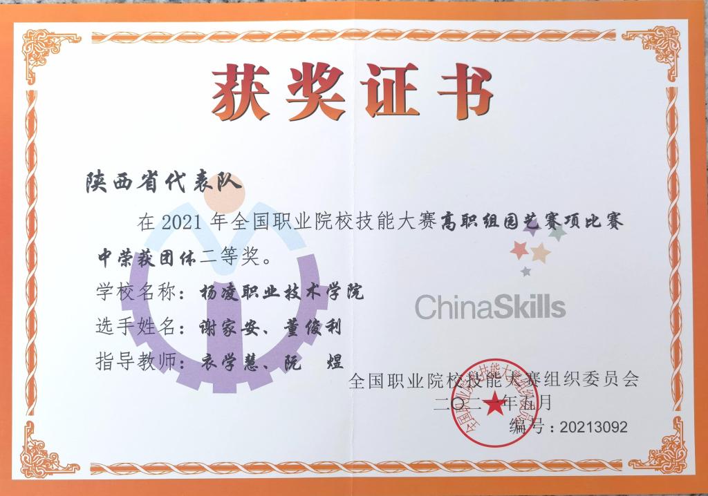 6月19至22日,2021年全国职业院校技能大赛(高职组)“园艺”赛项在潍坊职业技术学院举行。来自全国各省、市、自治区的28支代表队参赛。由威廉希尔官网学生董俊利、谢家安组成的陕西省代表队获二等奖。