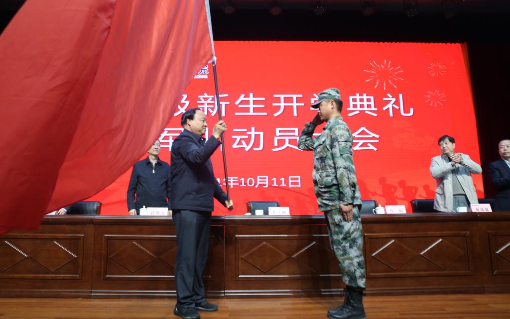 校长王周锁向军训团授旗