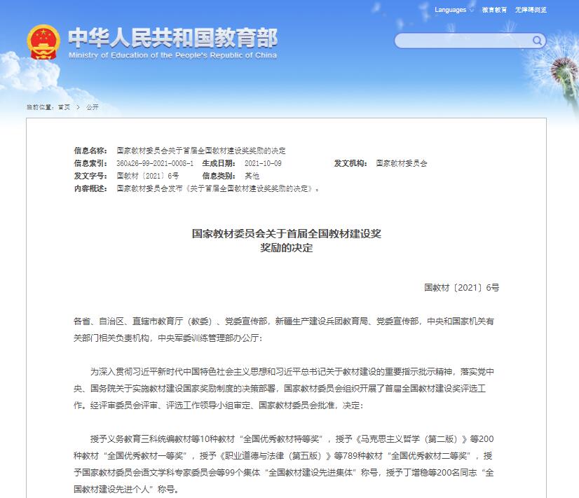 据悉,全国教材建设奖由国家教材委员会主办、教育部承办,每四年评选一次,对各级各类优秀教材和作出突出贡献的先进集体、先进个人予以表彰。此次首届全国教材建设奖评选是新中国成立以来首次设立全面覆盖教材建设各领域的专门奖励项目,也是全国教材建设领域的最高奖。