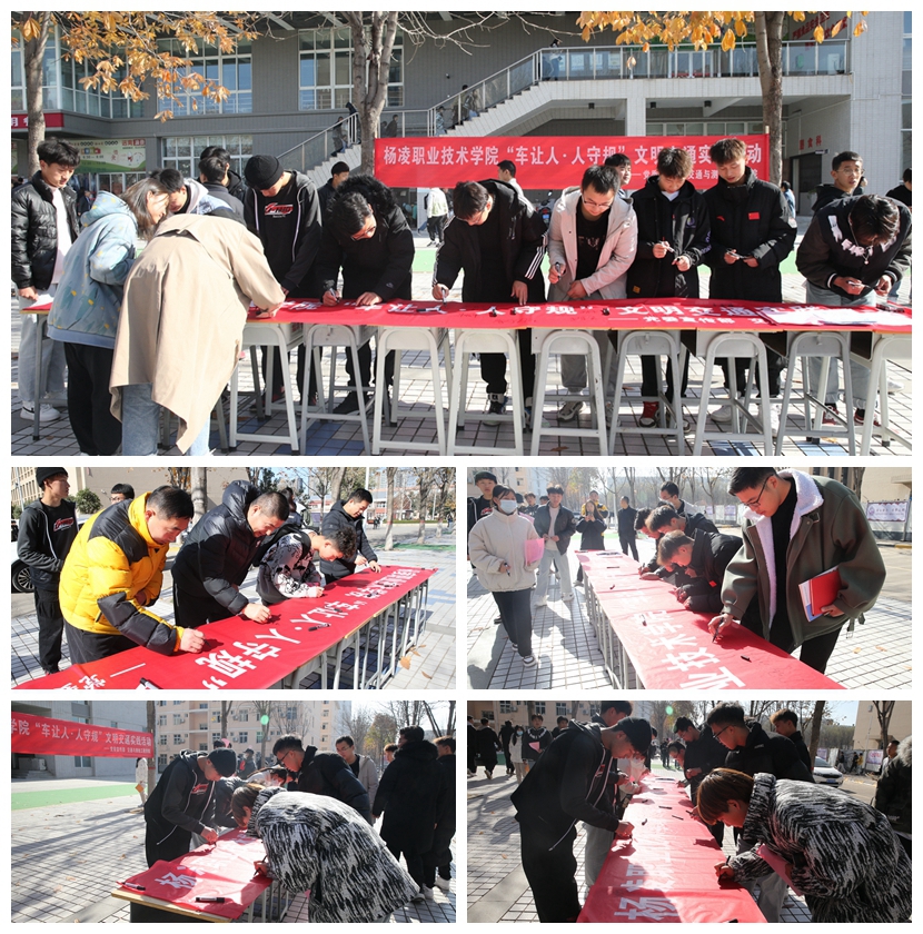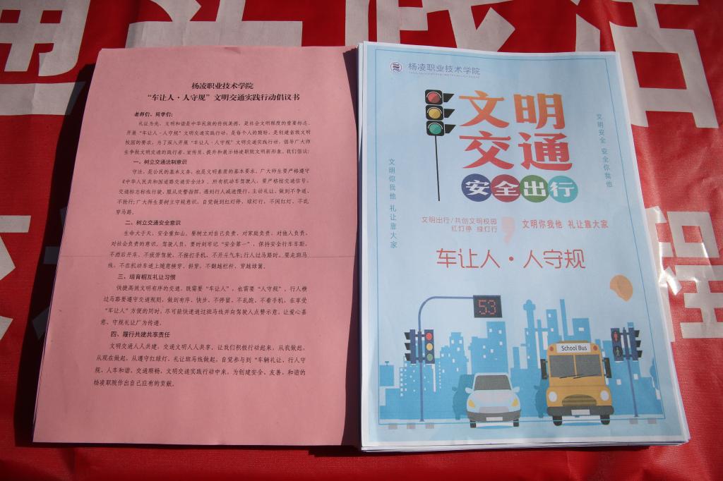 活动中,学校印发《“车让人·人守规”文明交通实践行动倡议书》和“车让人·人守规”公益海报,通过在停车场、食堂门口、校内各个路口等地向师生们发放资料、现场宣讲交通法律法规等形式,倡导广大师生争做文明交通的践行者、宣传员,提升和展示杨凌职院文明新形象。随后师生们纷纷在活动横幅上签上自己的名字。