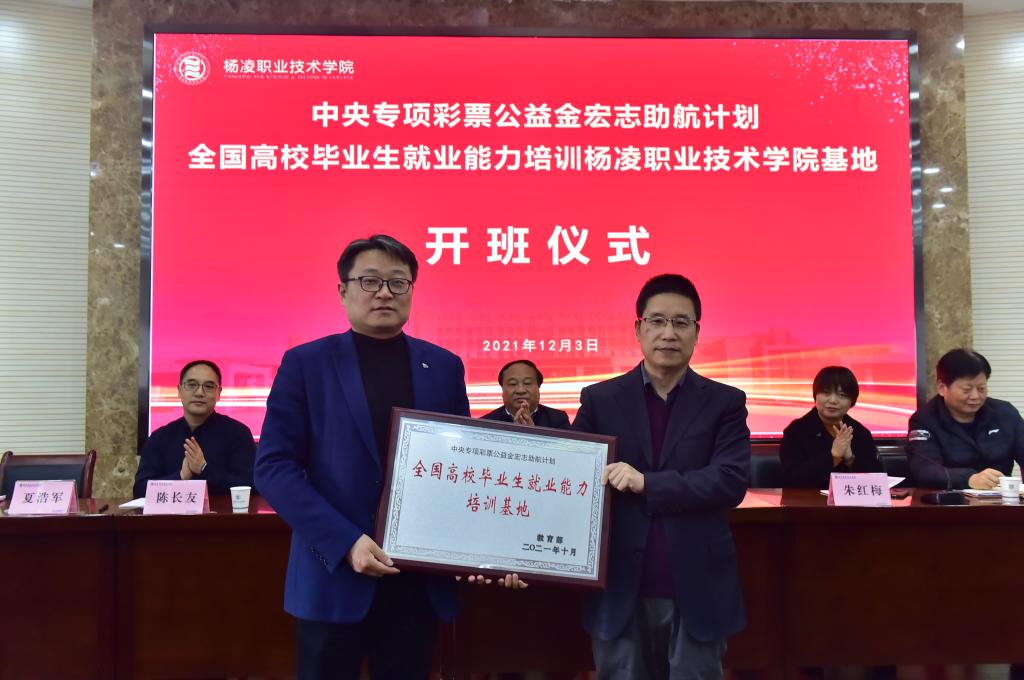 12月3日,中央专项彩票公益金宏志助航计划“全国高校毕业生就业能力培训基地”授牌暨2021年培训班开班仪式在南校区举行。陕西省教育厅学生处副处长白炀、西北农林科技大学就业中心副主任陈长友、杨凌示范区人才交流服务中心副主任朱红维,校长王周锁、校党委副书记任得元及各学院党总支书记,相关部门负责人、师生代表共70余人参加仪式。仪式由党委副书记任得元主持。