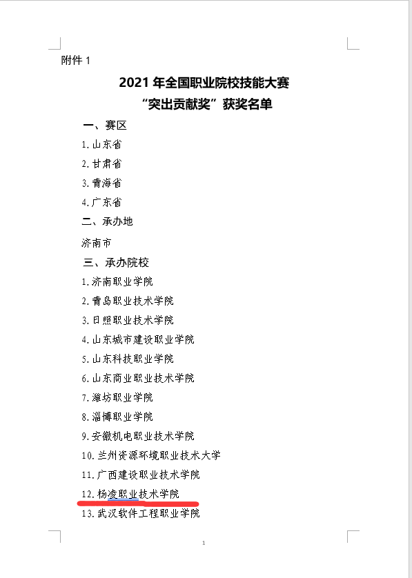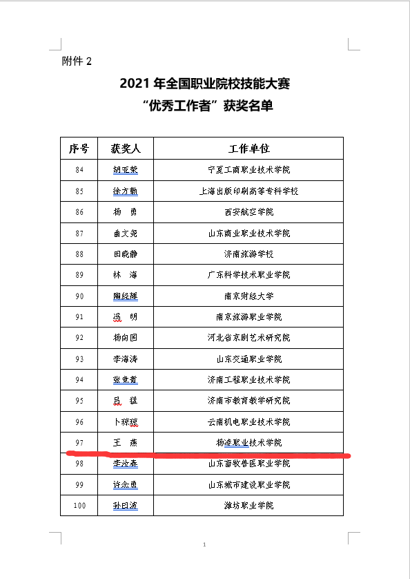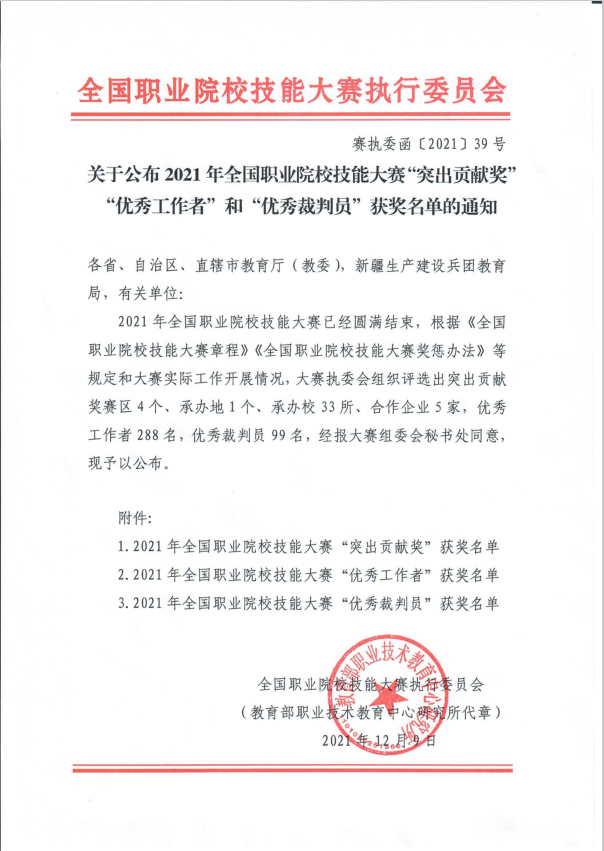 近日,全国职业院校技能大赛执行委员会公布了2021年全国职业院校技能大赛“突出贡献奖”、“优秀工作者”和“优秀裁判员”获奖名单,威廉希尔官网荣获“突出贡献奖”,生物工程学院副院长王燕被评为“优秀工作者”。