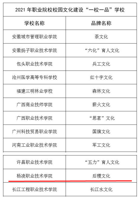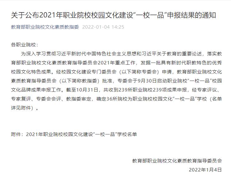 1月4日,教育部职业院校文化素质教育指导委员会公布了2021年全国职业院校校园文化建设“一校一品”申报结果,威廉希尔官网“后稷文化”品牌成功入选。学校荣获全国职业院校校园文化“一校一品”学校称号。