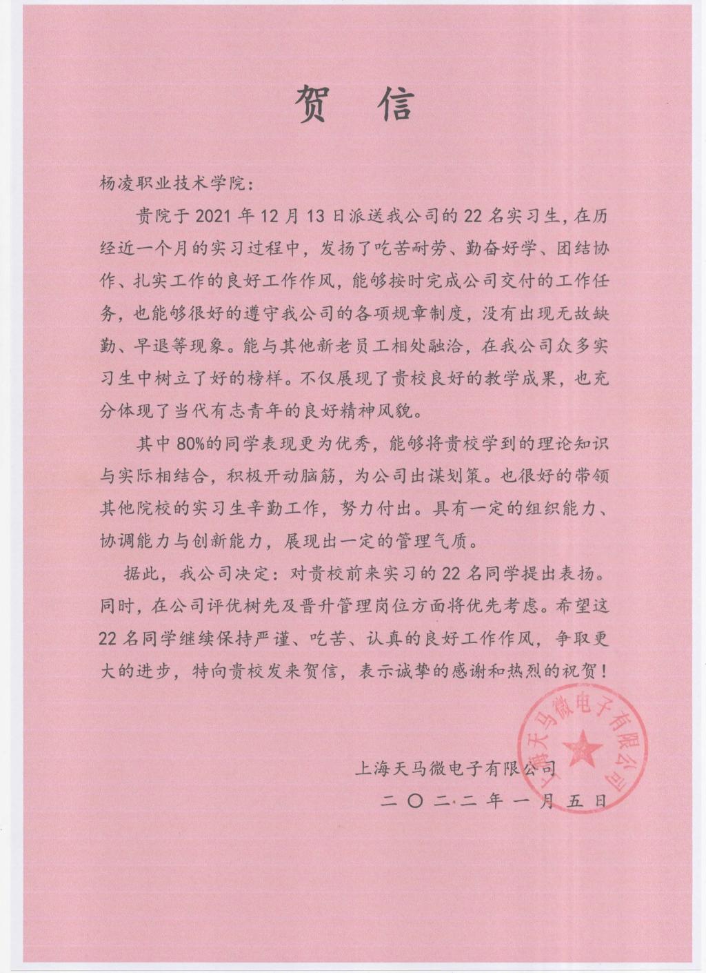 1月5日,上海天马微电子有限公司发来贺信,对威廉希尔官网机电工程学院和信息工程学院的22名实习生提出表扬。