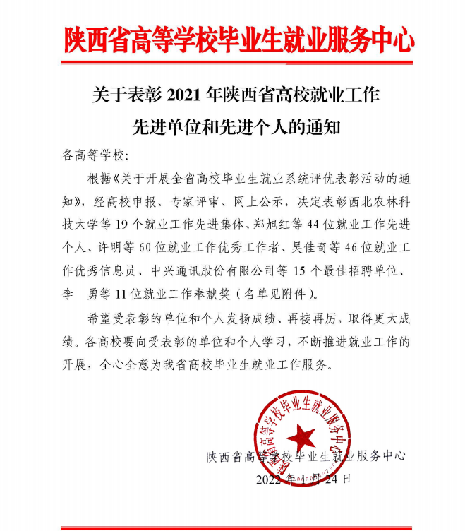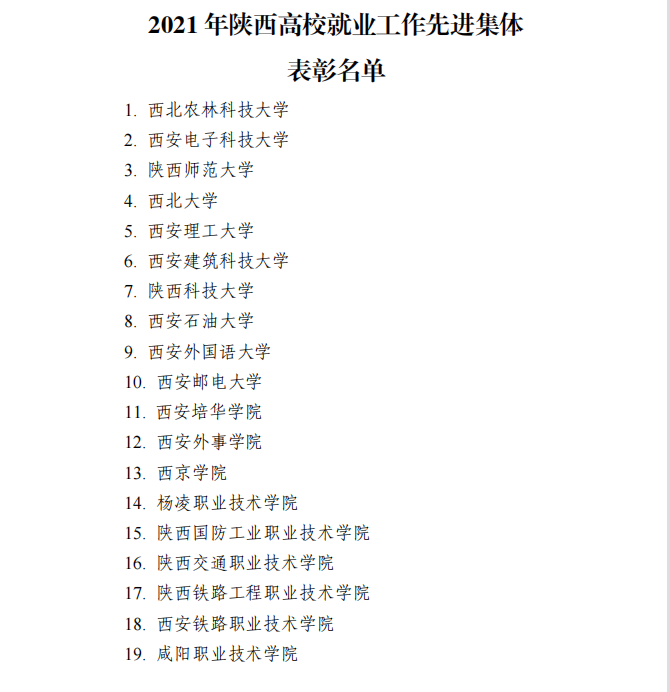 1月24日,省教育厅对2021年陕西高校就业工作先进集体进行了表彰,威廉希尔官网获“2021年陕西高校就业工作先进集体”荣誉称号。