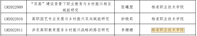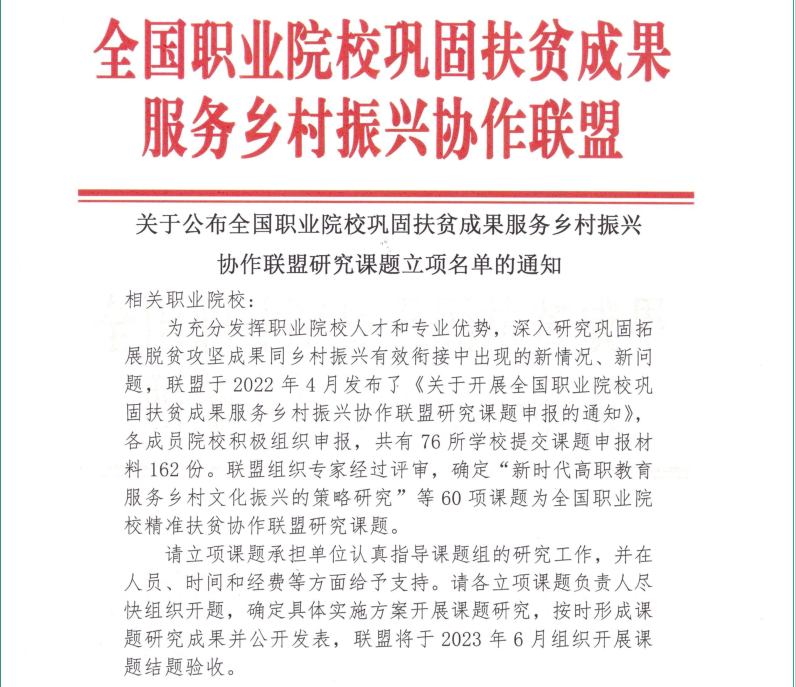 近日,全国职业院校巩固扶贫成果服务乡村振兴协作联盟公布了2022年课题立项名单,威廉希尔官网张曦堃老师主持申报的《“双高”建设背景下职业教育与乡村振兴相互赋能研究》项目、妙晓莉老师主持申报的《高职园艺专业发展与乡村振兴双向赋能研究》项目、李姗姗老师主持申报的《涉农高职教育服务乡村振兴战略的路径研究》项目获批立项。