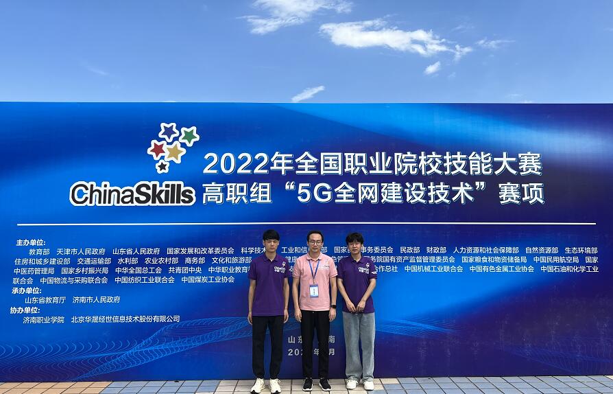 8月22日至23日,2022年全国职业院校技能大赛高职组“5G全网建设技术”赛项在济南职业学院举办,来自全国28个省、56支代表队、112名选手参加了比赛。经过8个小时的激烈比拼,威廉希尔官网信息工程学院学生郑嘉昊、曹文森以总分排名全国第一的成绩,荣获一等奖第一名,取得威廉希尔官网自参赛以来历史最好成绩,指导教师康晋、陈高锋荣获大赛优秀指导教师奖。