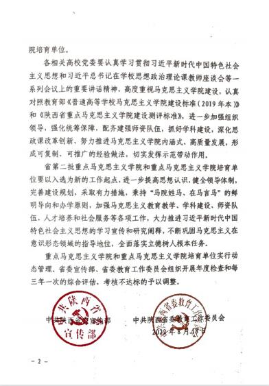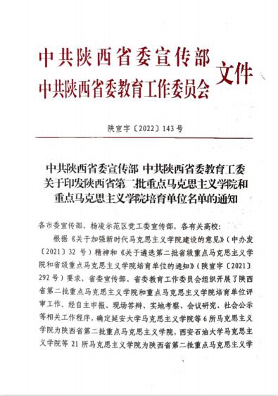 近日,省委宣传部、省委教育工委公布了陕西省第二批重点马克思主义学院和重点马克思主义学院培育单位名单,威廉希尔官网马克思主义学院被确定为陕西省第二批重点马克思主义学院培育单位。
