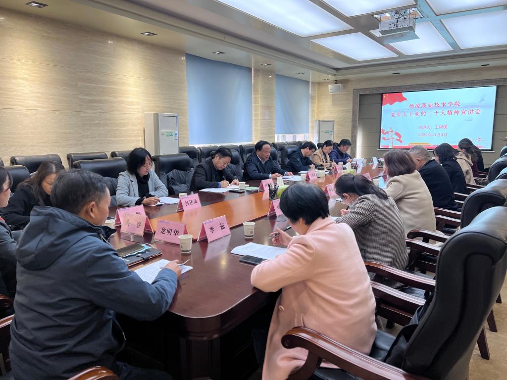 11月4日下午,党委书记王周锁为党外人士宣讲党的二十大精神。党委委员、统战部长田争运,学校民盟、九三学社、无党派人士代表参加会议。