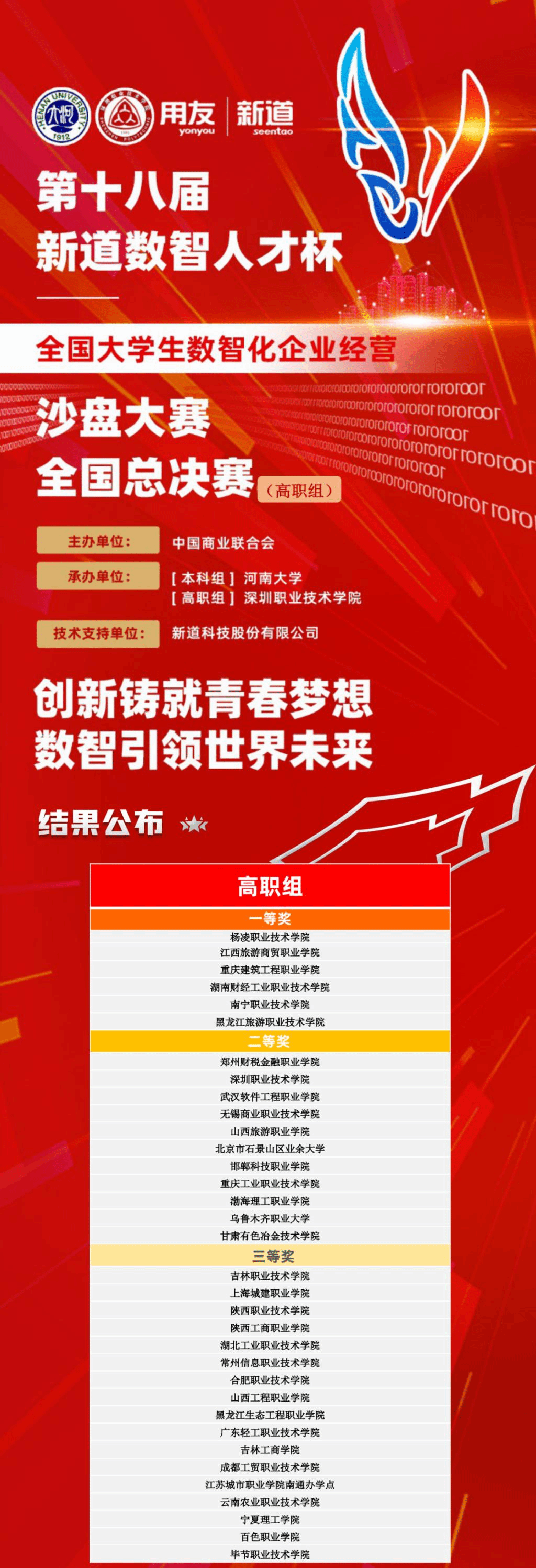 11月12日,第十八届“新道数智人才杯”全国大学生数智化企业经营沙盘大赛全国总决赛(高职组)圆满结束,经过一天的激烈的角逐,威廉希尔官网经济与贸易学院学生王家乐、刘虹池、鲁文杰、冯迎亮组成的参赛队以第一名的优异成绩荣获全国总决赛一等奖,这是威廉希尔官网在此赛项上取得的历史最好成绩。