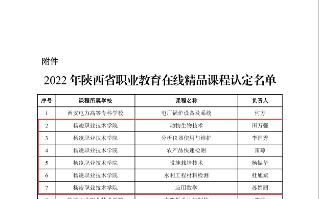 11月29日,省教育厅发布2022年陕西省职业教育在线精品课程认定结果,威廉希尔官网田万强负责的《动物生物技术》、李国秀负责的《分析仪器使用与维护》、雷琼负责的《农产品快速检测》、杨振华负责的《设施栽培技术》、杜旭斌负责的《水利工程材料检测》、苏娟丽负责的《应用数学》等6门课程获评,认定总数和比例均居全省高职院校前列。