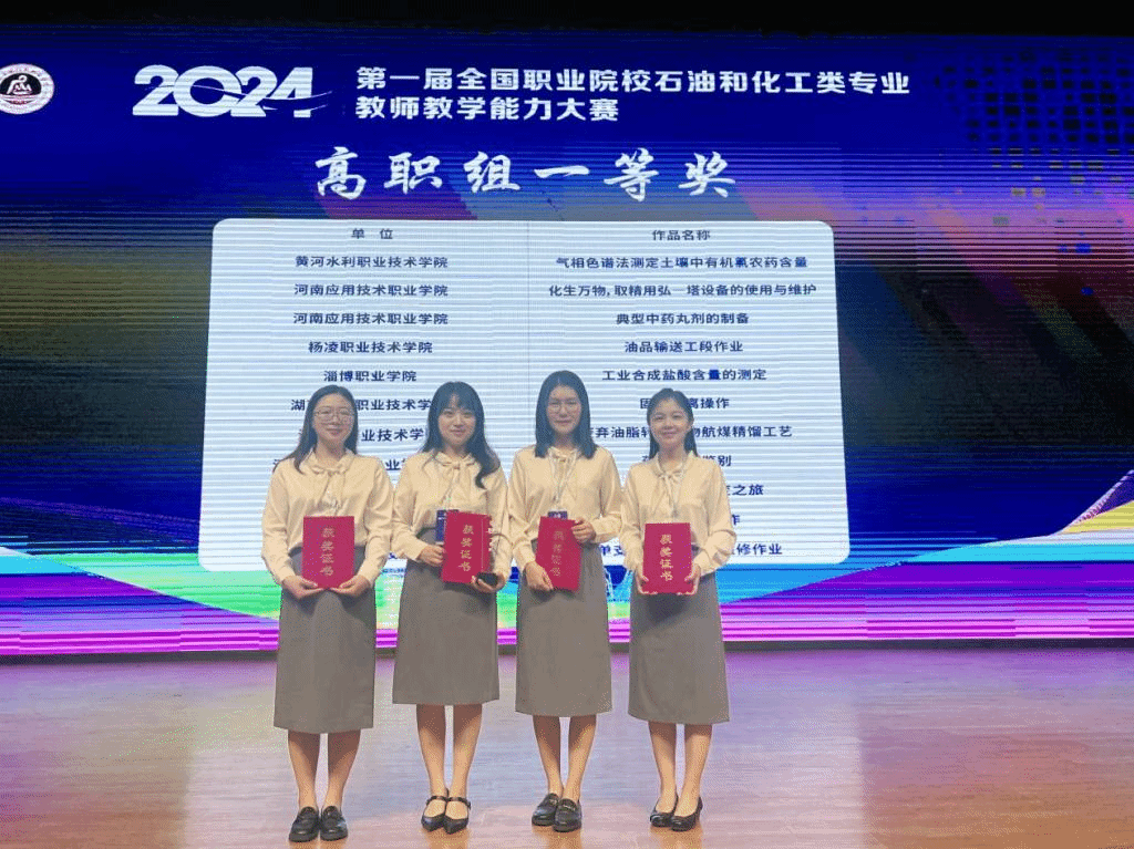 7月27日至29日,2024年首届全国职业院校石油和化工类专业教师教学能力大赛在河南应用技术职业学院举办。威廉希尔官网由药物与化工学院白洁、梁晓彤、杨子琪、李博组成的教师团队凭借深厚的理论功底、精湛的教学技能和较高的专业素养,从来自全国各地的73支参赛队伍中脱颖而出,斩获大赛一等奖。