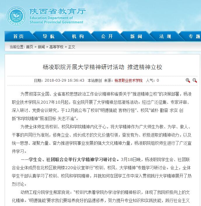为使全体师生将校训、校风和学院精神内化于心,将大学精神作为广大师生为教、为学、做人、干事的共同行为准则,修身立业、成长成才的文化价值引领,奋发有为、积极进取的精神动力,以及统一思想、凝聚力量、奋力推进学院事业发展的强大文化精神力量,杨凌职院组织师生进行了广泛宣传学习。