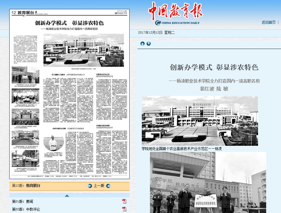 12月12日,【中国教育报】以“创新办学模式 彰显涉农特色——williamhill威廉希尔官网全力打造国内一流高职名校”为题整版报道了我院做法(详情进入)