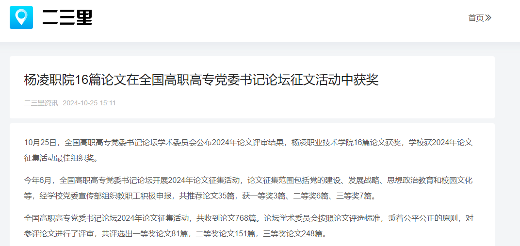 今年6月,全国高职高专党委书记论坛开展2024年论文征集活动,论文征集范围包括党的建设、发展战略、思想政治教育和校园文化等,经学校党委宣传部组织教职工积极申报,共推荐论文35篇,获一等奖3篇、二等奖6篇、三等奖7篇。