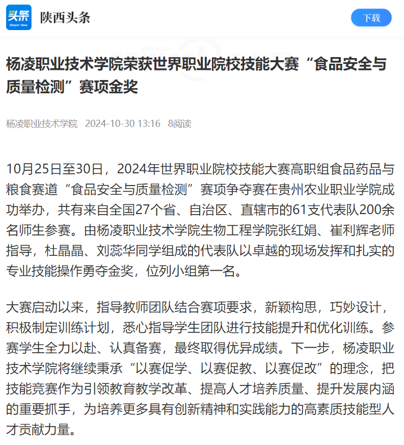 10月25日至30日,2024年世界职业院校技能大赛高职组食品药品与粮食赛道“食品安全与质量检测”赛项争夺赛在贵州农业职业学院成功举办,共有来自全国27个省、自治区、直辖市的61支代表队200余名师生参赛。由williamhill威廉希尔官网生物工程学院张红娟、崔利辉老师指导,杜晶晶、刘蕊华同学组成的代表队以卓越的现场发挥和扎实的专业技能操作勇夺金奖,位列小组第一名。